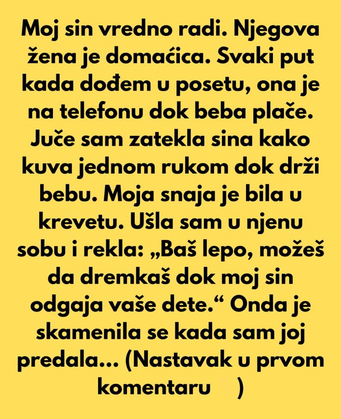 Jednog vikenda, bilo je previše. Došla sam u posetu, a moj sin je držao bebu jednom rukom i pokušavao da sprema večeru za sebe i ženu drugom rukom. I dok je on bio opterećen svime, ona je ostala u krevetu. Započela sam s čišćenjem, nahranila bebu i obrisala radne površine. Nisam joj ništa rekla, nisam je pitala da ustane, želela sam da vidim hoće li to sama shvatiti. Nije. Ostala je tu, nesvesna što se događa oko nje.