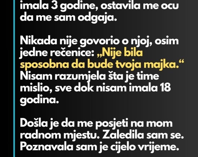 Žena je prišla, sramežljiva i uplakana, i izgovorila riječi koje su joj zauvijek promijenile život: „Vrijeme je da saznaš istinu. Ja sam tvoja majka.“