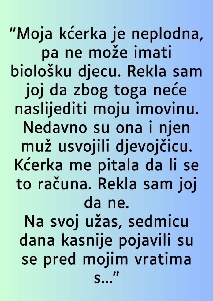 Jedno pitanje promijenilo je sve – kćerka je pitala majku da li smatra da usvojeno dijete vrijedi jednako kao i biološko. Odgovor je bio kratak i bolan: „Ne.“ U tom trenutku kćerka je shvatila da majčina ljubav dolazi s uslovima koje ona ne može ispuniti. Ako njeno dijete nije dovoljno, ni ona sama nikada neće biti. To saznanje probilo je posljednje niti povjerenja među njima.