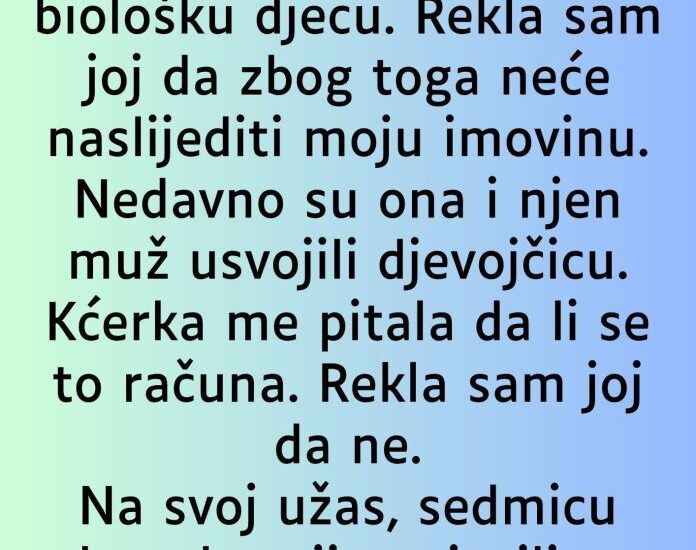 Jedno pitanje promijenilo je sve – kćerka je pitala majku da li smatra da usvojeno dijete vrijedi jednako kao i biološko. Odgovor je bio kratak i bolan: „Ne.“ U tom trenutku kćerka je shvatila da majčina ljubav dolazi s uslovima koje ona ne može ispuniti. Ako njeno dijete nije dovoljno, ni ona sama nikada neće biti. To saznanje probilo je posljednje niti povjerenja među njima.