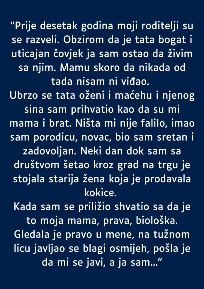 • Međutim, kako su godine prolazile, sve se činilo savršenim, ali ja sam i dalje osjećao neku prazninu. Neki dan, šetajući s prijateljima kroz grad, naišao sam na stariju ženu koja je prodavala kokice na trgu. Približujući se, osjetio sam da nešto nije u redu, ali nisam odmah znao što. U trenutku kad sam bio dovoljno blizu, moje srce je stalo – to je bila ona, moja mama. Iako je izgledala drugačije nego prije, prepoznao sam je odmah.