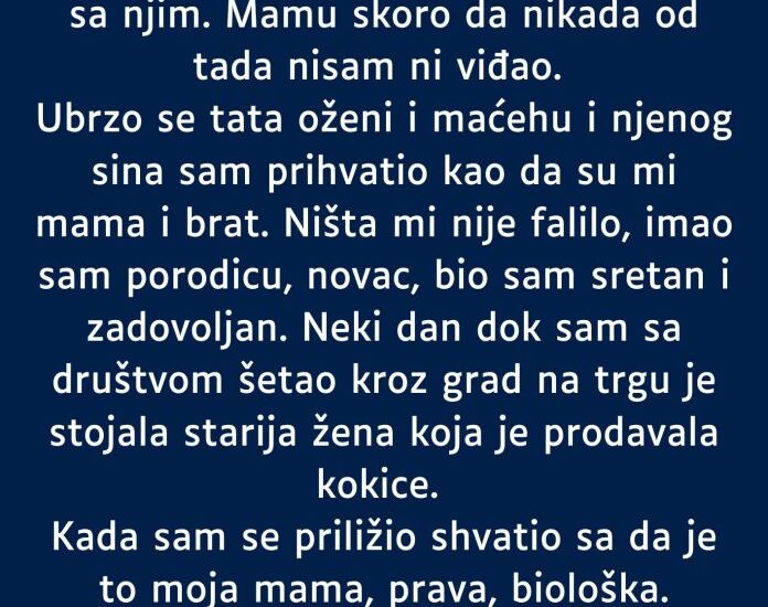 • Međutim, kako su godine prolazile, sve se činilo savršenim, ali ja sam i dalje osjećao neku prazninu. Neki dan, šetajući s prijateljima kroz grad, naišao sam na stariju ženu koja je prodavala kokice na trgu. Približujući se, osjetio sam da nešto nije u redu, ali nisam odmah znao što. U trenutku kad sam bio dovoljno blizu, moje srce je stalo – to je bila ona, moja mama. Iako je izgledala drugačije nego prije, prepoznao sam je odmah.